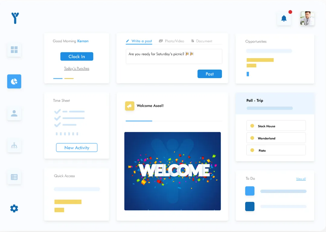 The social wall is designed to help you share important news quickly with the entire company. To keep everyone informed and connected.